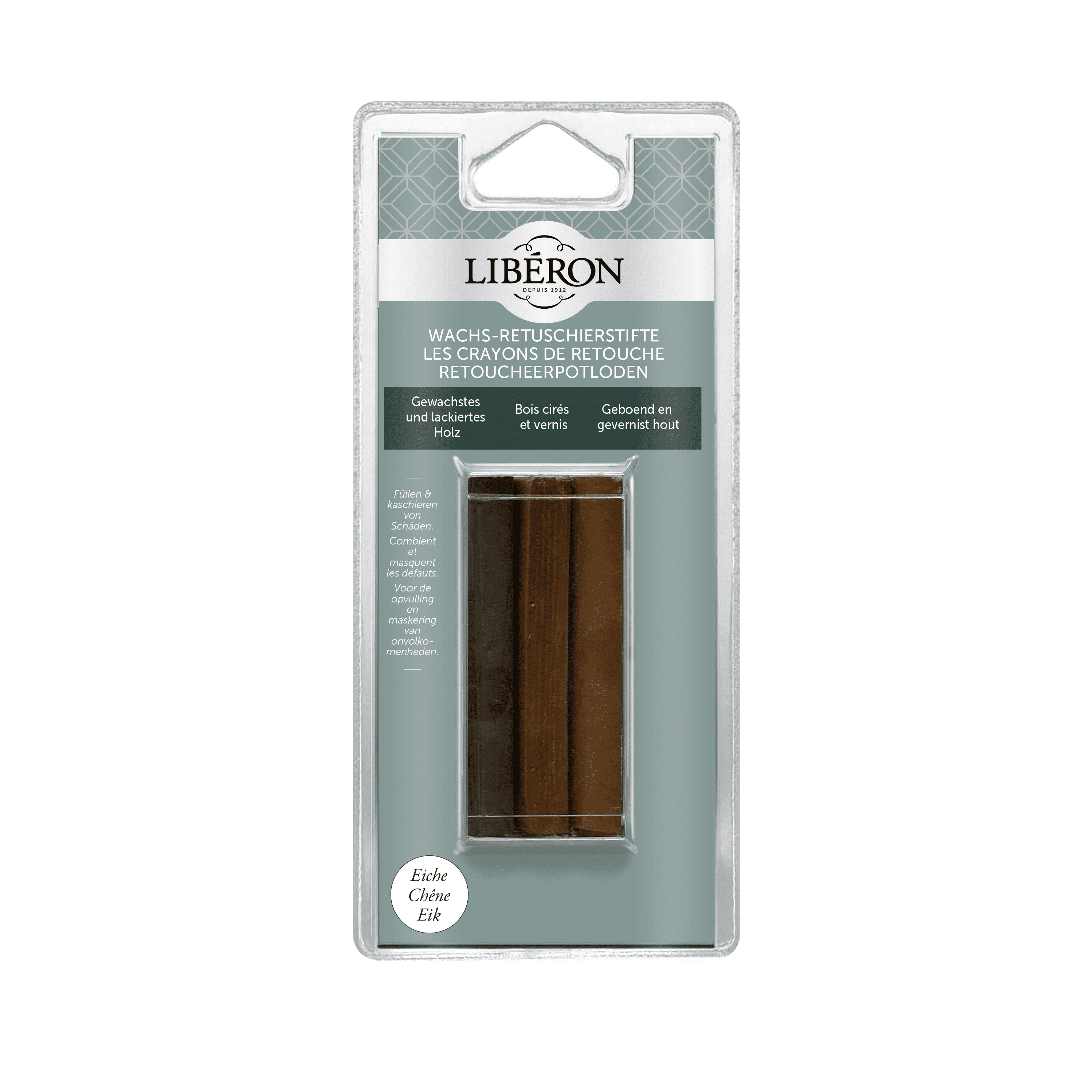 Les Crayons de Retouche, composés de cires dures colorées, permettent de remplir par simple frottement les éraflures, rayures, traces de griffes de vos meubles en bois.