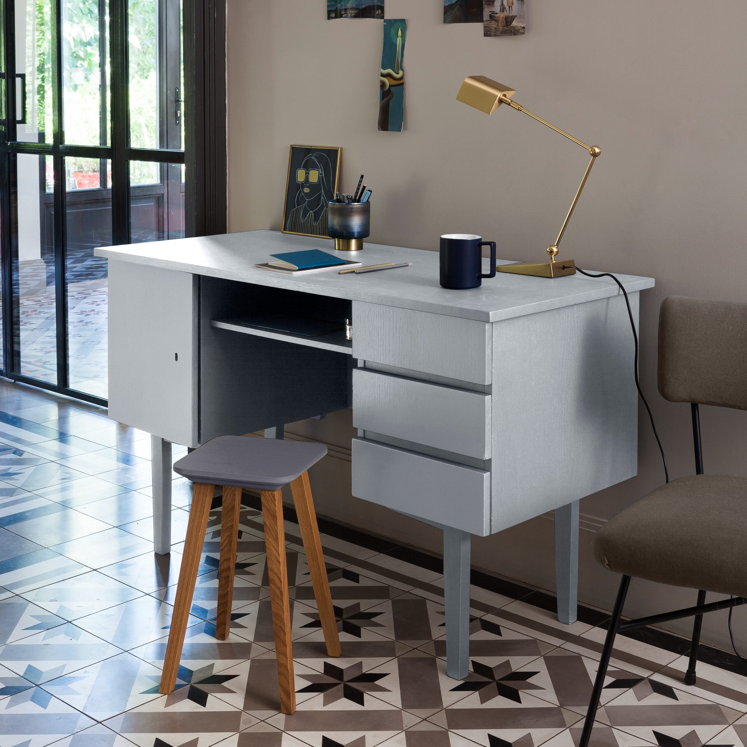 Variant du chaud au froid, Le Métal Poudré joue les contrastes métallisés. Il habille meubles, objets et boiseries de précieuses nuances métalliques veloutés à la sobriété élégante.