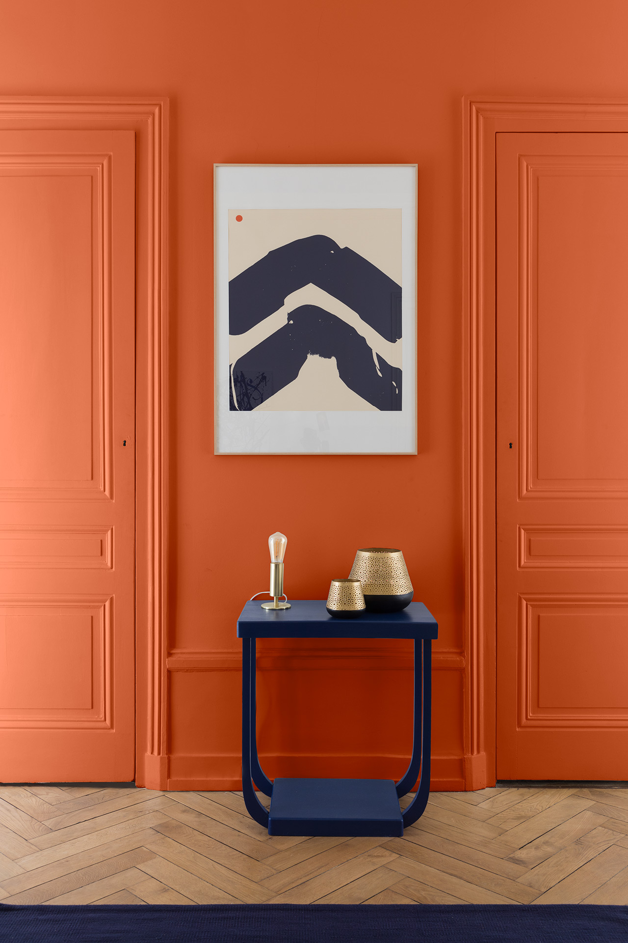 Nous avons joué le mobilier Bleu Klein en contraste sur un mur en total look orangé pour apporter à ce couloir style et caractère.